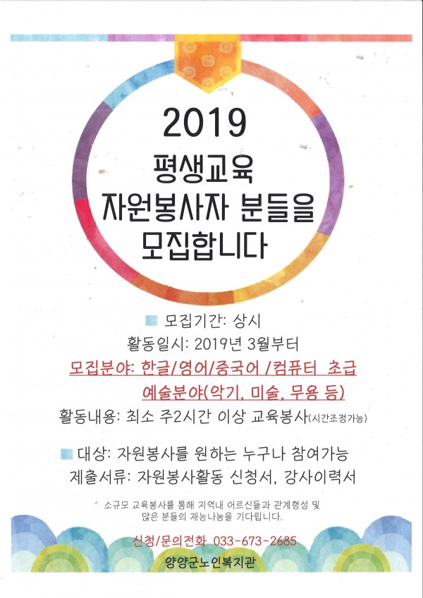 2019 평생교육프로그램 자원봉사자를 모집합니다. 페이지 정보 작성자 댓글 0건 조회 8,252회 작성일 18-11-23 09:11 본문 . 목록 이전글제7회 종합예술제 "은빛청춘! 꿈의 날개를 펴다" 18.12.04 다음글2018년 노인돌봄기본서비스사업 현황조사인력 채용 공고 18.11.02 댓글목록 댓글목록 등록된 댓글이 없습니다.