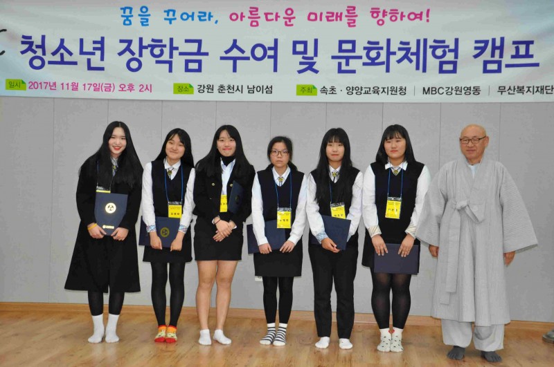 사회복지법인 대한불교조계종 무산복지재단(이사장: 정념스님)은 2017년 11월 17일(금요일) 오후 2시 낙산유치원 강당에서 양양관내 초등학생 20명, 중학생 25명, 고등학생 25명으로 총 70명에게 장학금 4,000만원을 전달하였습니다.
