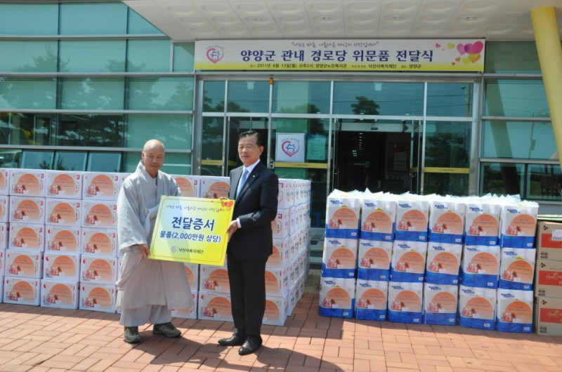 낙산사복지재단(이사장/ 법인스님)은 6월 13일 오후 2시 양양군노인복지관 에서 양양군 관내 경로당 122곳에 전달할 위문품(시가 2,000만원 상당)을 정상철 양양군수에게 전달하였습니다.
